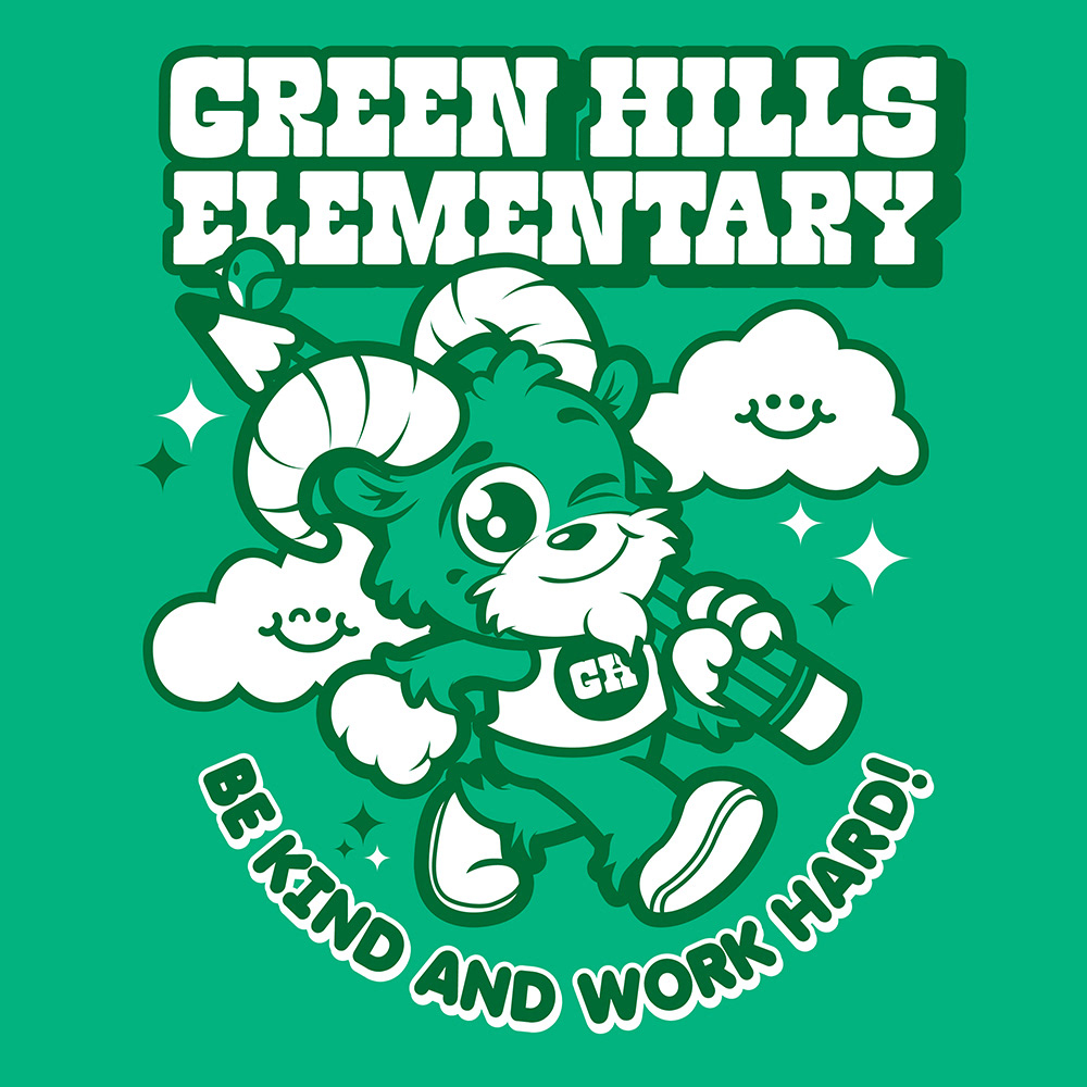 Check out this fun illustration I did for my kids’ school t-shirts. “Be Kind and Work Hard!” Client: Green Hills Elementary