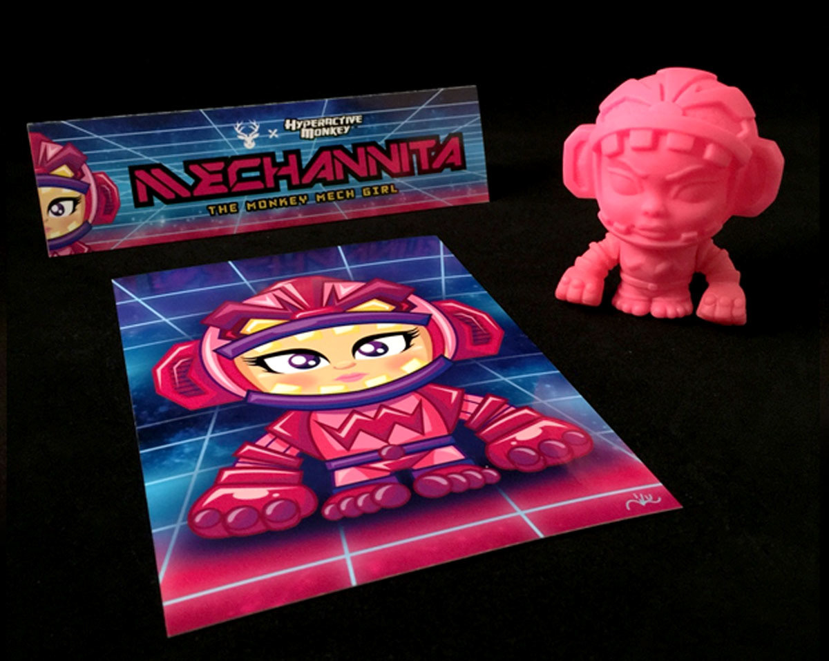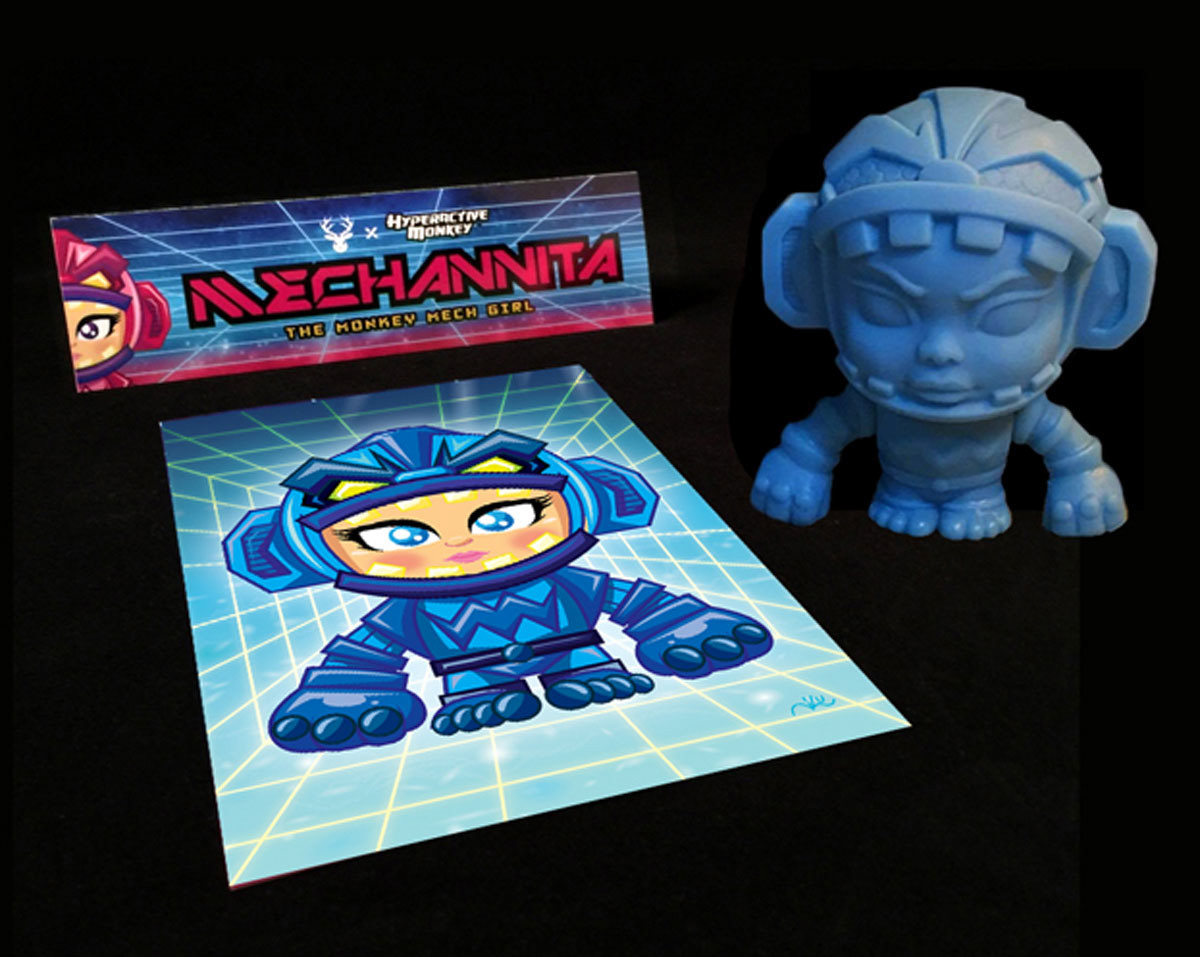 I have an affinity towards robots, monkeys, and cute girls. So naturally I teamed up with the talented sculptor Macsorro to make them come true. The result was our very own production vinyl figure. Mechannita stands around 3.5" tall and is articulated at the head and arms. She is ready to save our galaxy from any intergalactic menace! SCULPTOR: Macsorro