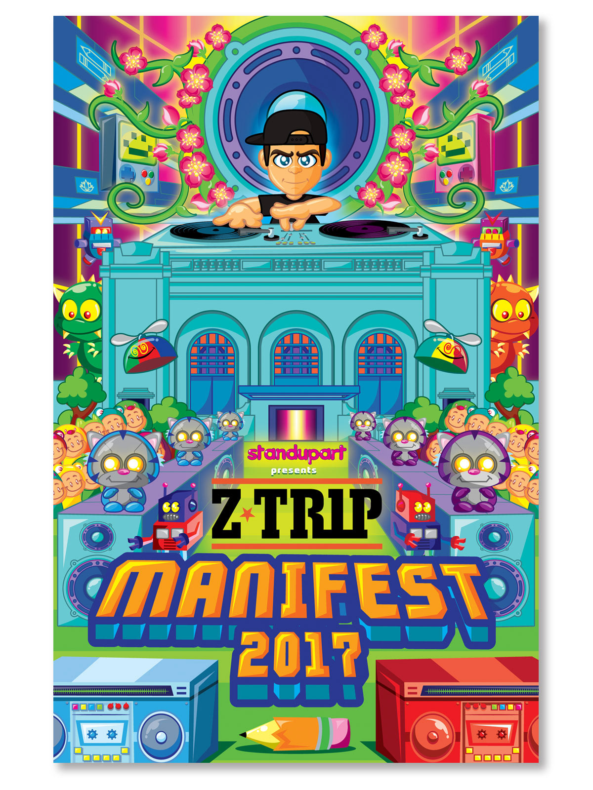 My poster design for Standup Arts musical festival Manifest in Oakland. The featured musical act was DJ Z-Trip. It's always an honor to draw such legends of the music industry. CLIENT: Standup Art